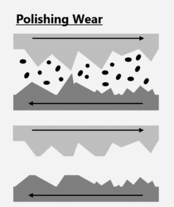 - Later operational life: contaminants such as metal shavings, sand, or rust may generate abrasive wear, which eventually leads to polishing.